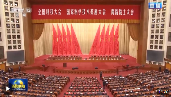 △全國科技大會、國家科學(xué)技術(shù)獎勵大會、兩院院士大會在北京人民大會堂舉行。(總臺央視記者李增仁拍攝)