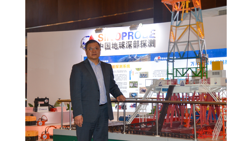 ■黃大年在2013年中國(guó)地球深部探測(cè)項(xiàng)目年會(huì)上的照片,身旁是他率領(lǐng)團(tuán)隊(duì)研發(fā)的“地殼一號(hào)”萬(wàn)米大陸科學(xué)鉆探機(jī)的展示模型(2013年4月18日攝)。新華社發(fā)