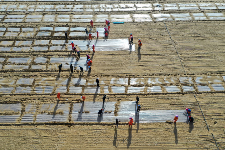 在新疆和田地區(qū)于田縣沙產(chǎn)業(yè)實驗基地,當(dāng)?shù)厝罕娫诜N植薏米(2025年4月8日攝,無人機(jī)照片)。新華社記者 丁磊 攝