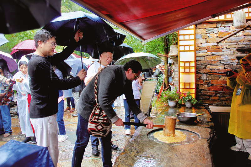 裹著洋芋香氣撲面而來(lái)。哥倫比亞詩(shī)人赫爾曼·帕爾多在村民手把手的指導(dǎo)下,掄起木錘捶打著石臼中的芋泥,笨拙又認(rèn)真的模樣,引得周?chē)l(fā)出陣陣歡快的笑聲。