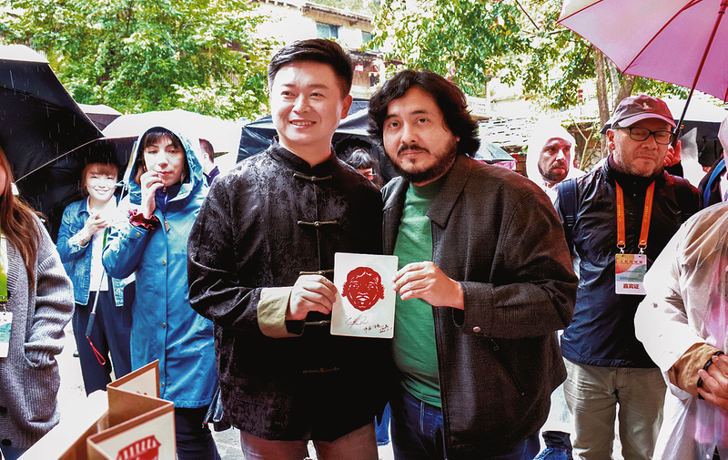 循著歌聲徐徐前行,不遠(yuǎn)處的洛南剪紙攤前,各式各樣的臉譜鋪滿桌面,紅紙?jiān)谒嚾耸У闹讣夥w,剪刀開(kāi)合間,一個(gè)人物臉譜便躍然紙上。巴拿馬詩(shī)人哈維爾·阿爾瓦拉多端坐攤位前,面帶微笑,滿懷期待地盯著藝人的雙手,不一會(huì)兒,哈維爾·阿爾瓦拉的面容在紅紙上逐漸顯現(xiàn)。