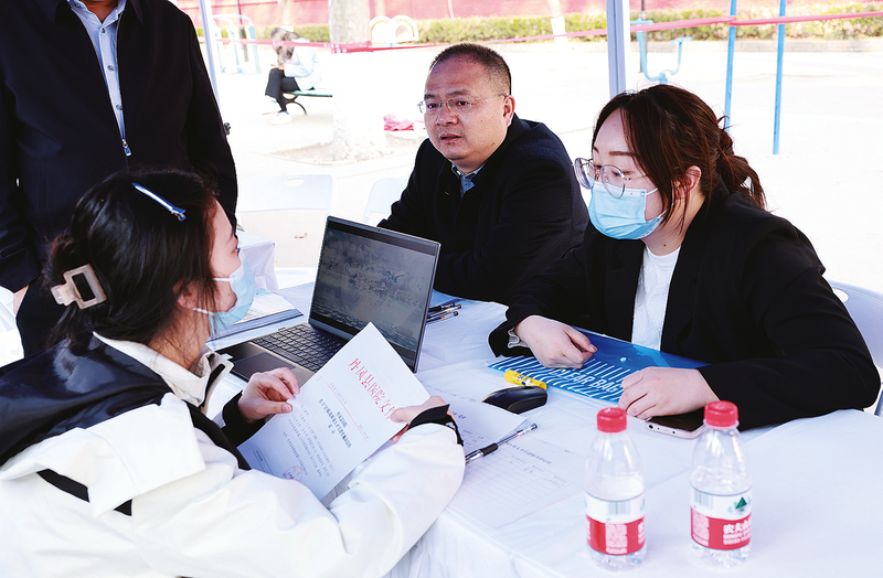丹鳳縣醫(yī)院院長高應東(中)在春季校園招聘會上為醫(yī)院引進人才