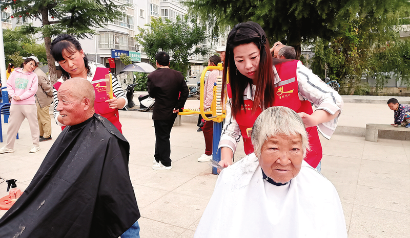 近日,志愿者在景村街社區(qū)廣場開展孝德實踐活動,為轄區(qū)老人義務理發(fā)。