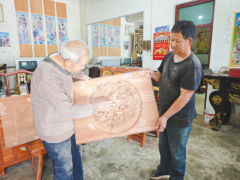 10月9日,黨繼生(左)展示兒子黨軍華雕刻的《二龍戲珠》。