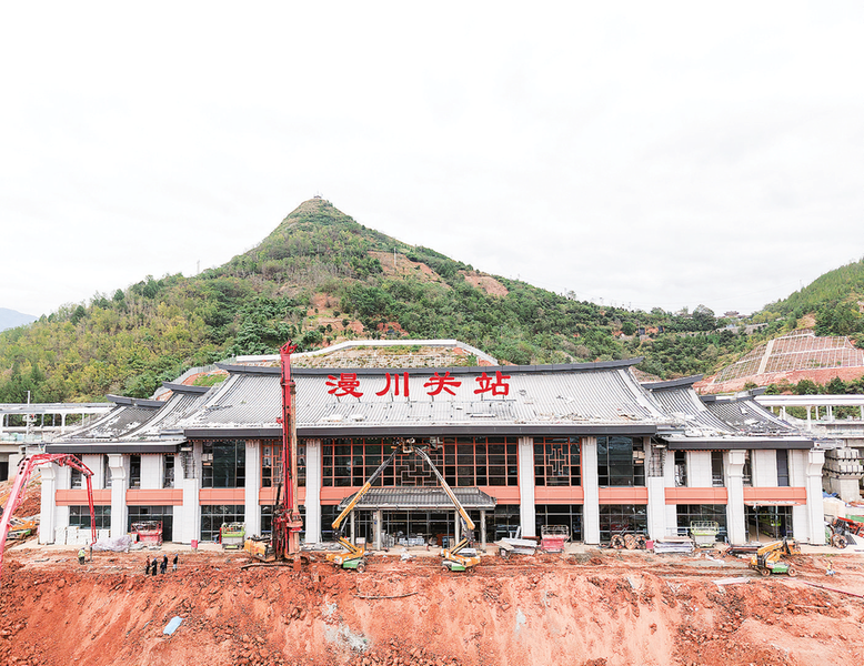 西十高鐵全線唯一在建制鎮(zhèn)設(shè)置的高鐵站——漫川關(guān)站,站房屋頂形態(tài)提取自古鎮(zhèn)錯(cuò)落層疊的屋頂群,體現(xiàn)出古鎮(zhèn)建筑鱗次櫛比的壯觀景象。圖為10月14日,站前廣場(chǎng)正在緊張有序施工。