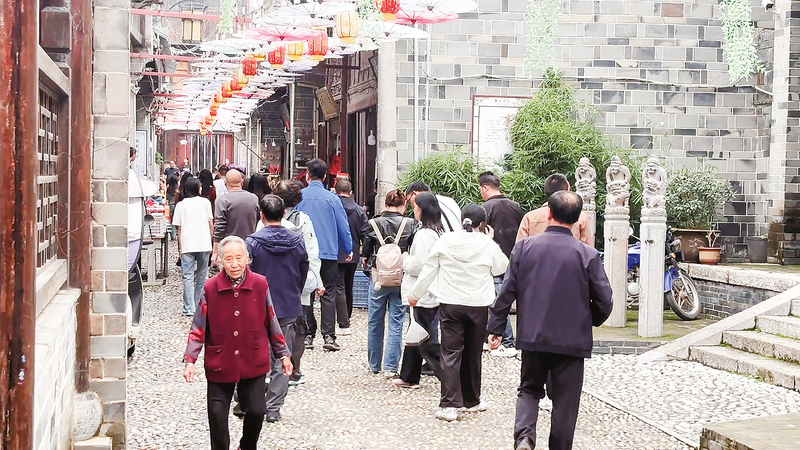 晨曦初露,薄霧如紗般籠罩著秦嶺南麓的層巒疊嶂,千年古鎮(zhèn)正從沉睡中蘇醒。明清街青石板路被歲月磨得溫潤(rùn),“和”字石刻在晨曦里閃耀著金光。隨著清脆的腳步聲漸次響起,街道兩旁的商戶開啟了一天的忙碌:卸下斑駁的門板支起攤點(diǎn),擺上苞谷酒、臘肉、蜂蜜等土特產(chǎn)……仿佛在一瞬間,古街便人頭攢動(dòng),熱鬧了起來。而那兼具南北腔調(diào)的吆喝聲,悠揚(yáng)婉轉(zhuǎn),繞過古建筑的飛檐翹角,輕拂馬頭墻的苔痕,散落成青山綠水間的永恒。