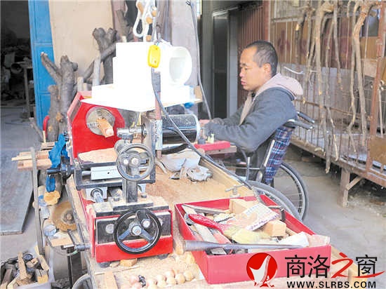 賈滿濤打算開啟第二次人生。他首先制作了一個(gè)康復(fù)站立架,改裝了一個(gè)電動(dòng)輪椅,并請(qǐng)來(lái)朋友根據(jù)自己的設(shè)計(jì)在院里做了一個(gè)簡(jiǎn)易升降器,因?yàn)榉课莸鼗^高,想要出門還要下幾級(jí)臺(tái)階,有了這個(gè)升降器,就可以坐在輪椅里自由出行了。出行問(wèn)題解決了,賈滿濤又想利用自己的一技之長(zhǎng),將村里的殘疾人召集起來(lái),開個(gè)加工廠。想法雖好,但實(shí)踐起來(lái)卻有很多困難,一是工人都是殘疾人,很多工作都無(wú)法開展;二是資金困難,賈滿濤的第一個(gè)想法就此夭折了。此后,他還加工過(guò)殘疾人蹲便器、電動(dòng)輪椅等,均因各種原因未能做長(zhǎng)久。“我一直在努力的嘗試,告訴自己只要努力就會(huì)有希望。”賈滿濤說(shuō),他一直在關(guān)注鎮(zhèn)安殘疾青年馬華的微博動(dòng)態(tài),“我和馬華在西安打工時(shí)就認(rèn)識(shí),那時(shí),我們都還是健壯的年輕小伙,不料幾年間,我們就相繼遭遇了意外。”執(zhí)著于公益事業(yè)的馬華在微博里經(jīng)常發(fā)一些各地殘疾人自立自強(qiáng)的貼子,看到雙腿高位截癱的婦女帶著笑容在田里耕地,無(wú)法行走的小伙依然學(xué)會(huì)了開車的故事,賈滿濤的信心更強(qiáng)更足了。有一次,他在看電視時(shí)無(wú)意中發(fā)現(xiàn)了獎(jiǎng)杯上的刻字,就想“自己能不能也在玻璃、木頭上刻字呢?”賈滿濤上學(xué)時(shí)就愛好書法、繪畫,這么多年,也是一有時(shí)間就抽空練習(xí),有了想法他就嘗試用刀子在玻璃上或木頭上刻上字或小動(dòng)物,感覺(jué)還不錯(cuò)。他又自己改裝了幾臺(tái)機(jī)器,加工起串珠、手杖等木質(zhì)工藝品。然后開著電動(dòng)輪椅拿著他的手工藝品去棣花景區(qū)賣,效益還不錯(cuò)。“好的時(shí)候,一天賣個(gè)百十塊錢,能給娃娃買個(gè)紙、筆啥的。”殘疾的自己也可以掙錢了,賈滿濤很是欣慰。