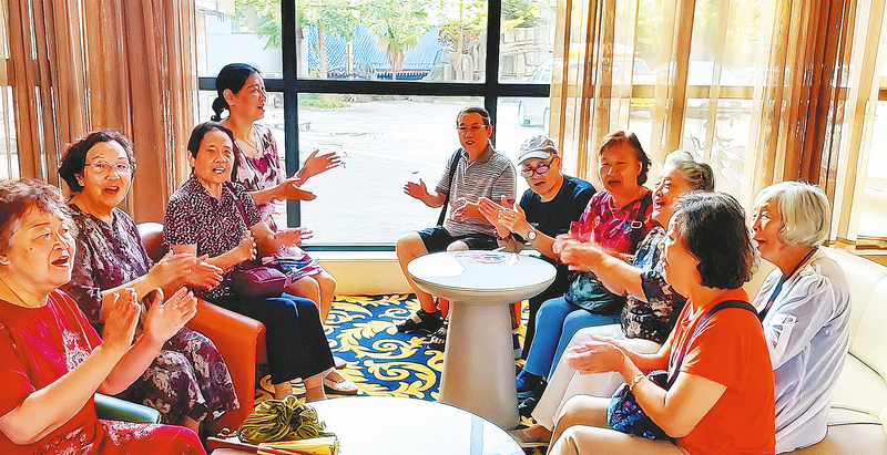 ?聚秀山莊酒店內(nèi),老人們圍坐一堂,或拍手或歡唱,在溫馨的環(huán)境中以歌會(huì)友,其樂融融。